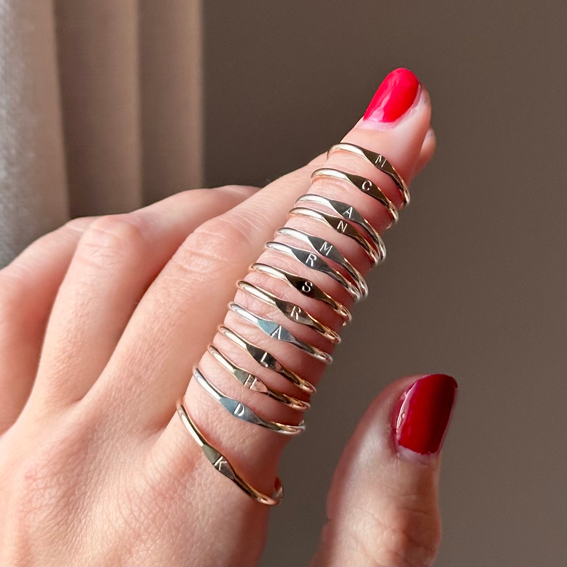 choose a letter to wear that represents someone special in your life. each ring is hand-stamped by Vanessa for a personal touch.
