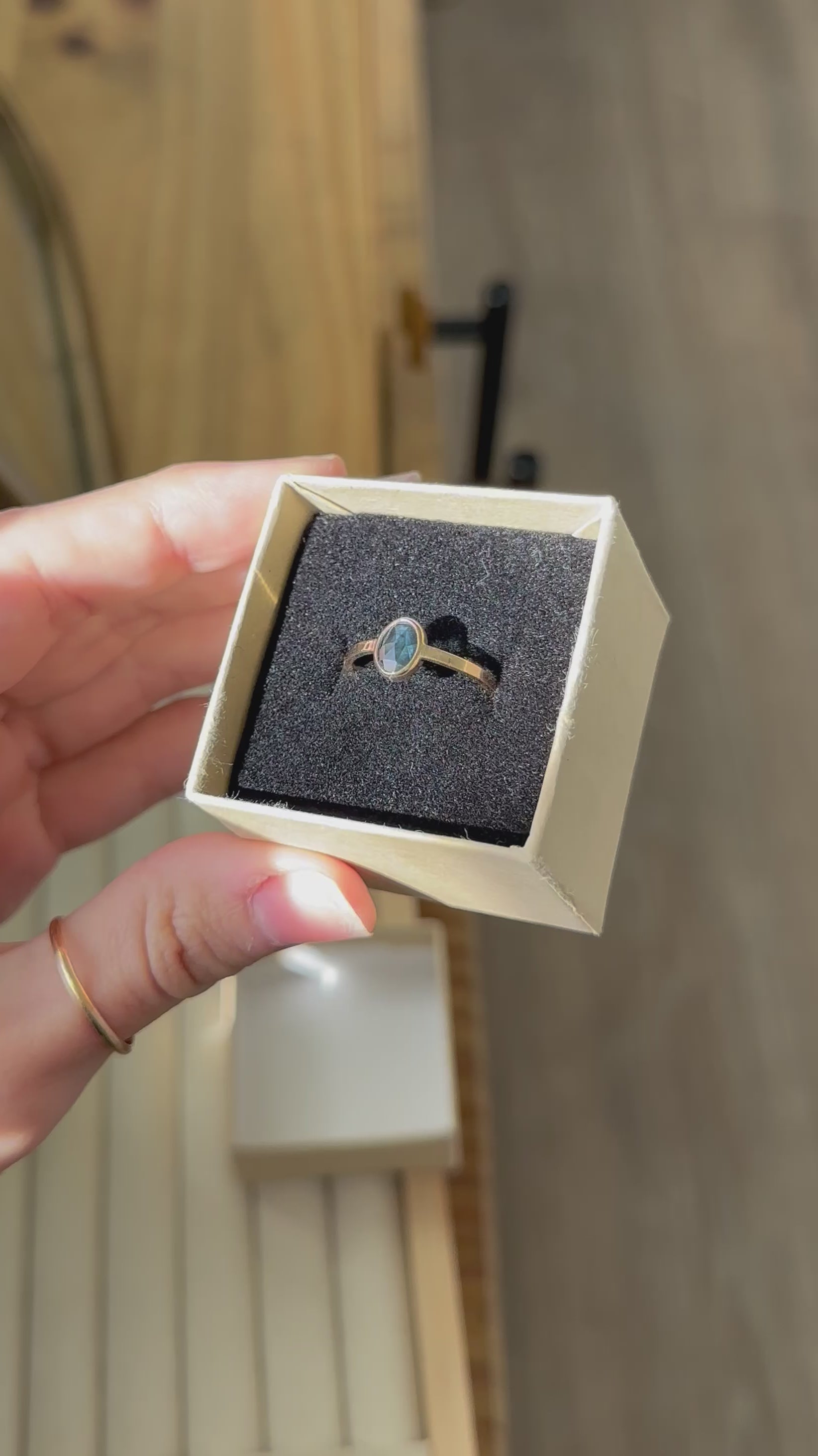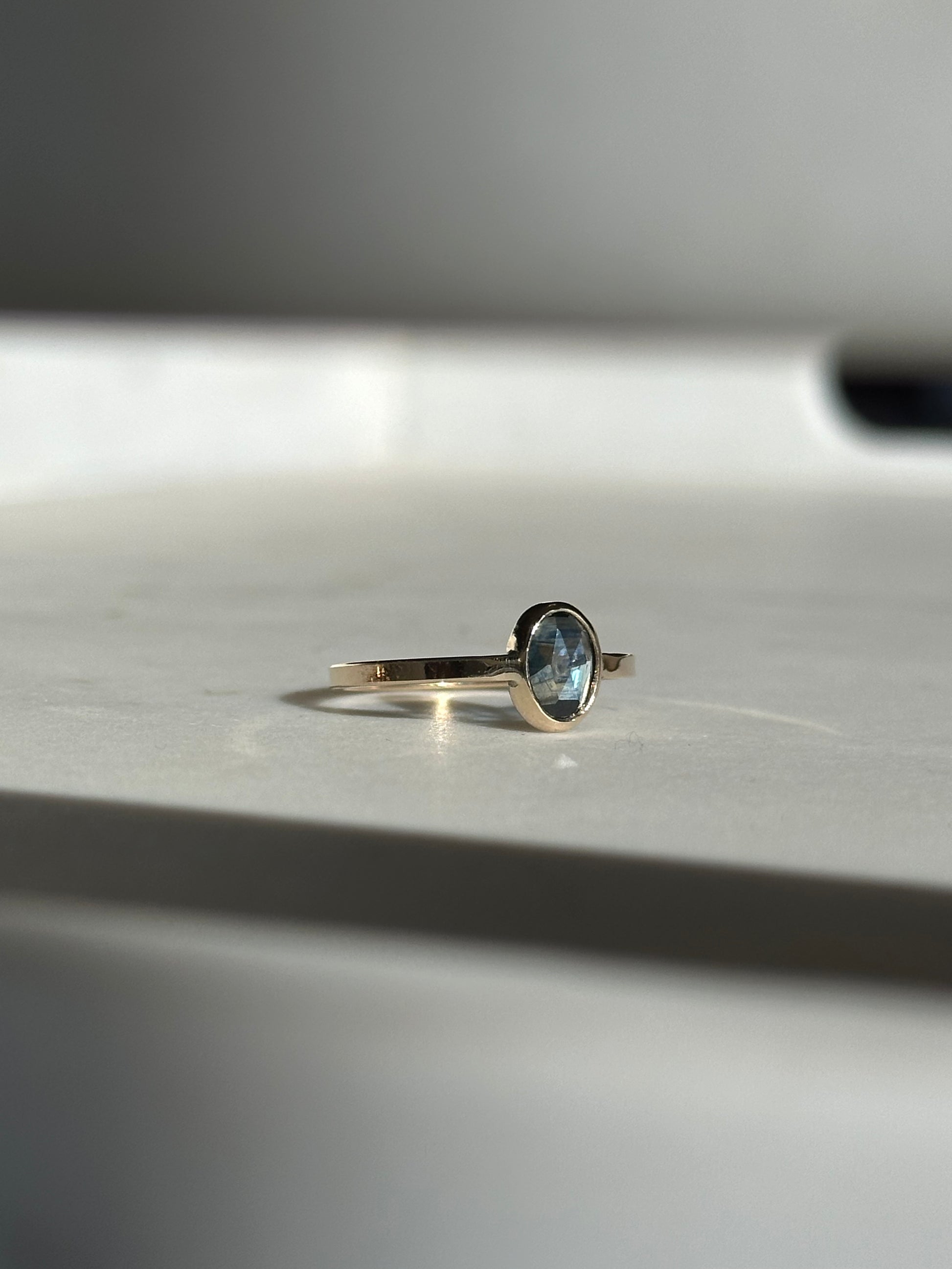 this stunning rose cut, oval Montana Sapphire is wrapped in a 14k yellow gold backless bezel